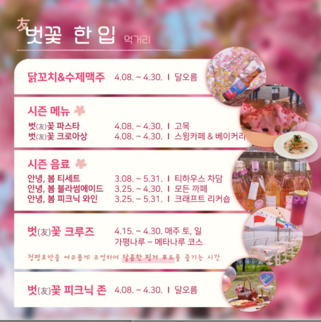 - 벗(友)꽃 한 입 : 봄 시즌 특별 메뉴로 수제맥주 존, 시즌 한정 메뉴, 별밤로맨틱 BBQ 등이 있습니다.