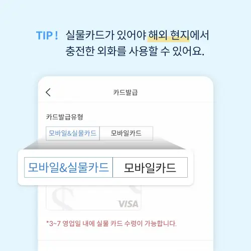 - 전 세계 VISA ATM에서 출금이 가능합니다. 만약에 현금이 필요한 경우에도 편리하게 이용할 수 있습니다.