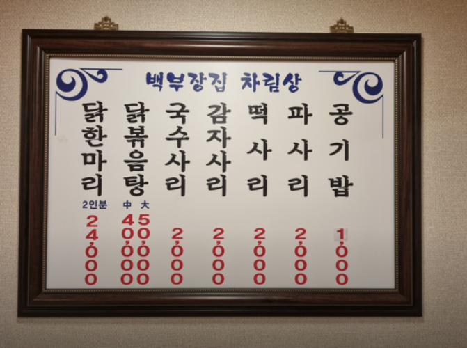 - 대표메뉴 : 닭한마리 - 24,000원 / 닭도리탕(중) - 40,000원