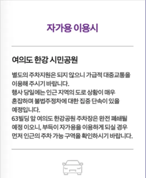 행사장 주변이 혼잡할 수 있으니 가급적이면 대중교통을 이용해서 오시는 게 편리합니다.
