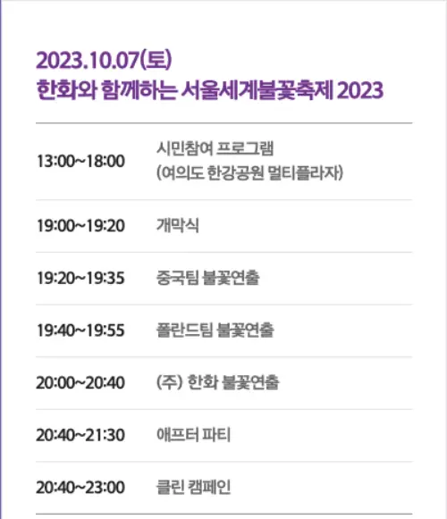 한화에서 주관하고 한국, 중국, 폴란드 3개국이 펼치는 아름다운 불꽃의 향연을 즐기기 좋은 시간이 될 것입니다.