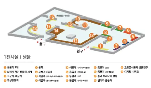 한반도에 살고 있는 다양한 생물을 생물분류학에 따른 일곱 개 무리로 구분하여 순서대로 전시하였습니다.