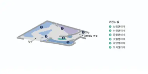 산림과 동굴, 하천, 갯벌, 해양 등 한반도의 대표 서식지에서 살아가는 생물표본을 사실적으로 연출하여 야생생물의 생태를 체험할 수 있습니다.