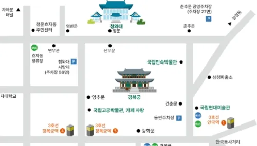 - 3호선 경복궁역 4번 출구로 나와 청와대까지 도보 15분 소요