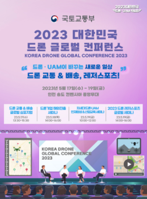 2023 대한민국 드론 글로벌 컨퍼런스는 드론 전달 및 운송에 대한 심포지엄과 해외 진출, 인재 양성, 드론 레포츠에 대한 3개 세미나로 구성되어 있습니다.
