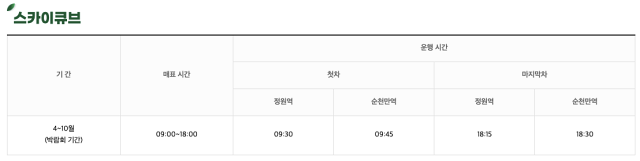 - 스카이큐브 이용객이 많은 경우나 기상 상황 악화 등 운행 상황에 따라 탑승 전 대기시간이 길어질 수 있습니다.