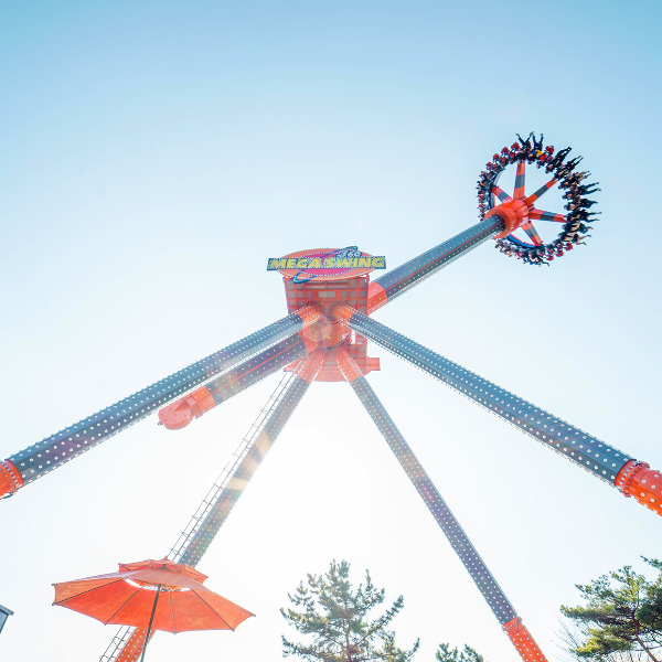- 메가 스윙: 공중을 자유롭게 날아다니는 스릴을 느낄 수 있는 국내 최초의 360도 회전 놀이기구.