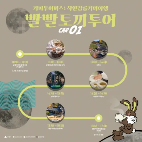 빨빨토끼투어와 슬슬거북이투어로 나뉘어서 강릉을 누비며 다양한 관광투어를 할 수 있는 커피투어!!