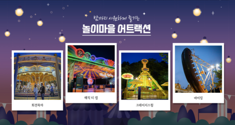 - 놀이마을 어트랙션 : 야간 놀이공원도 운영중이니 다이나믹한 재미도 함께 즐겨보세요.