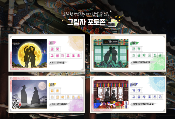 - 그림자 포토존 : 민속마을 전통 가옥에서 만나는 조선의 밤 생활상을 그림자 이야기로 만나는 곳입니다. 달빛, 단청, 연분, 가마 컨셉으로 사랑하는 사람과 그림자 포토존에서 좋은 추억 남겨보시기를 추천드립니다.