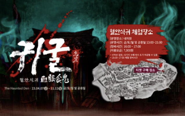 귀굴은 한국민속촌에서 남량특집으로 진행하는 공포체험입니다. 2023년에는 'ㅜ기굴 : 혈안식귀'라는 주제로 워크스루형 공포체험으로 야외 코스와 실내 폐가 코스로 나뉘어 진행됩니다. 저녁 7시 30분 ~ 10시까지 사전 예약제로 운영됩니다. 초등학생 이하, 노약자, 임산부, 심장 질환자는 체험이 불가능합니다. 귀굴은 매우 무서운 공포체험으로 SNS에서도 반응이 뜨거웠습니다. 공포를 좋아하시는 분들이라면 한번 도전해보시는 것도 좋을 것 같습니다.