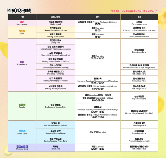 또한 사또의 생일잔치 마당극이나 조선팔도유람, 사또의 저울질 이벤트 등도 즐길 수 있습니다. 한옥카페 약과방에서는 전통 트렌드 디저트를 맛볼 수 있습니다. 약과방에서는 엽전으로 결제할 수 없으니 현금이나 카드를 준비하세요. 축제 기간 동안에는 생일선물을 가져오거나 엽전을 갖고 재방문하는 관람객에게 할인 혜택도 제공됩니다.