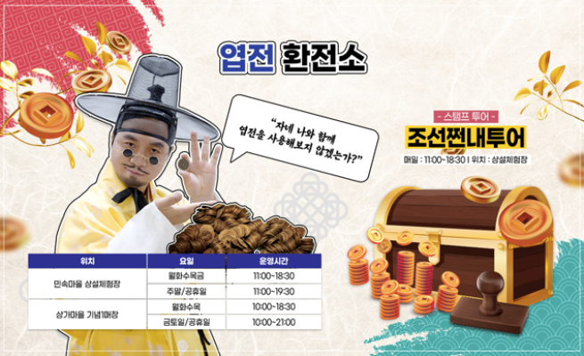 엽전 환전소에서 충분한 엽전을 환전하고 민속마을에서 다양한 체험과 구매를 즐겨보세요. 엽전은 축제 기간 동안에만 사용할 수 있으니 남기지 마세요.